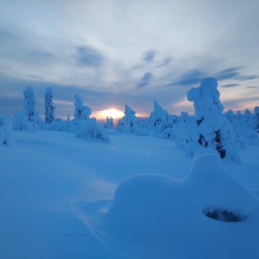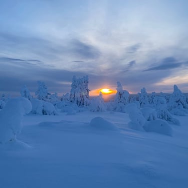 Partez pour une randonnée de 12 km avec 300 m de dénivelé et laissez-vous émerveiller par des panoramas à couper le souffle sur toute la région. Le chemin traverse une forêt pétrifiée par la neige, où chaque arbre semble figé dans un décor féerique, créant une atmosphère magique et silencieuse. Tout au long du parcours, vous serez accompagnés de notre fidèle malamute Buzz, qui ajoute chaleur, joie et complicité à cette aventure inoubliable en pleine nature arctique.