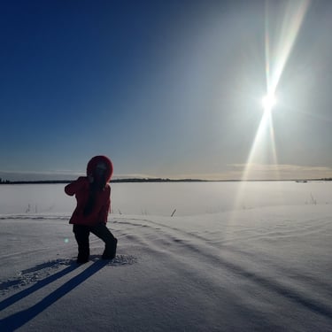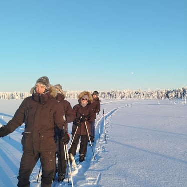 Au départ du chalet, partez en autonomie pour une balade en raquettes au cœur des paysages enneigés de Laponie, entre forêts boréales silencieuses et étendues immaculées à perte de vue. Le calme profond, seulement rythmé par le crissement de la neige sous vos pas, offre une véritable immersion dans la nature arctique. À la nuit tombée, l’aventure peut se prolonger sous un ciel étoilé, avec l’espoir d’apercevoir les aurores boréales danser au-dessus des sapins givrés.